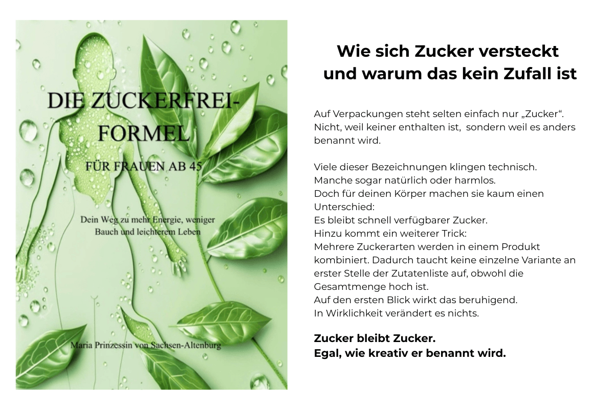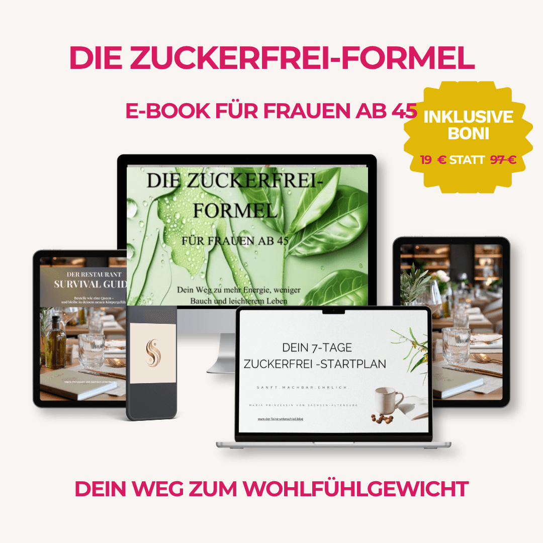Mit der Zuckerfrei-Formel zeige ich dir, wie du deinen Heißhunger regulierst und deinen Körper ab 45 wieder verstehst, ohne eiserne Disziplin, ohne radikalen Verzicht und ohne dass du alles auf den Kopf stellen musst.